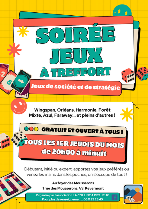 Tous les premiers jeudis du mois, de 20h à minuit, l'Association LA COLLINE A DES JEUX vous propose des soirées jeux à la Résidence des Mousserons.