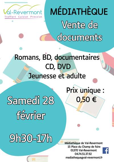 Journée d'ouverture non stop 9h30 - 17h00. Une belle occasion de se faire plaisir sans se ruiner (tout à 50 cts pièce), et de découvrir la médiathèque de Val-Revermont si vous ne la connaissez pas encore !